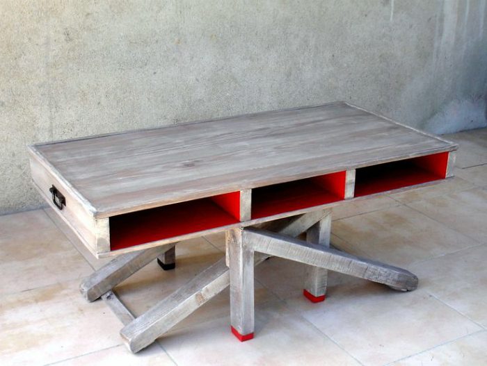 Оригинальный письменный стол, сделанный из деревянных поддонов, изюминкой которого стали элементы насыщенного красного цвета.