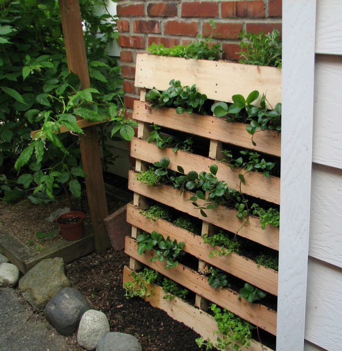 Из ненужного деревянного поддона можно смастерить очаровательную тумбу для садового шланга с небольшим цветником сверху.