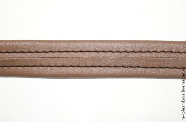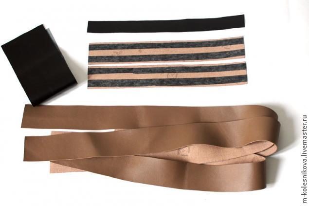 Детали ремешка выкраиваю по долевой, ничем не укрепляю. Три детали: две длиной 100 см, одна 70 см, шириной 5 см (будет использована пряжка 2,5 см). Внутренние планки также проклеены флизелином. Из коричневого кожзама выкраиваю кант шириной 3 см, длина 33 см. И еще нужен кусочек на будущий клапан.