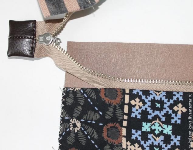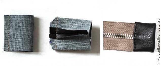 Подворачиваем и закрепляем свободные кончики молнии вовнутрь, ориентируясь на метку 3см на планке.