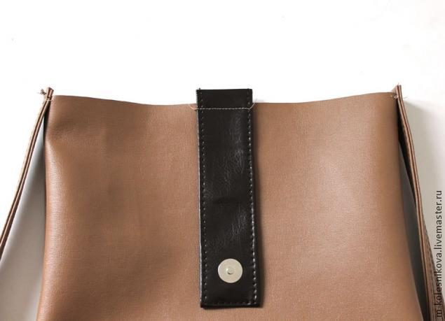 Клапан. Деталь размером 6 на 34 см. Складываем пополам, установив посередине магнитную кнопку. Магнитную кнопку лучше установить на подложку из кожи или плотного фетра. Стачиваем по боковым швам с припуском 0,5 см. Сверху на магнитную кнопку я еще настрачиваю кусочек кожзама, чтобы на лицевой стороне клапана не проступало крепление кнопки. Выворачиваем, отстрачиваем по краю.