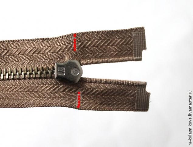 Вшиваем молнию. На молнии отмечаем мелом линии начала зубчиков.