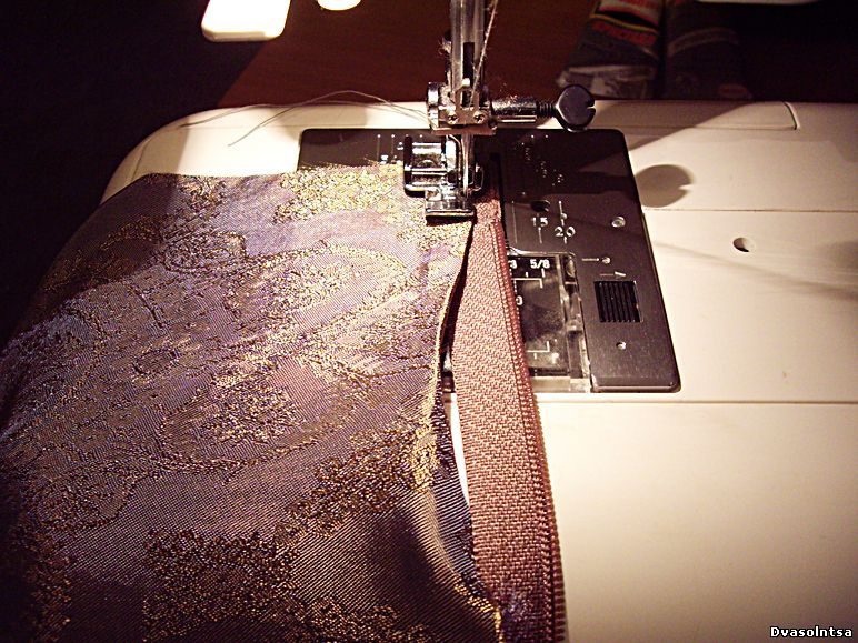 Теперь попытаемся сделать на второй детали большой карман на молнии. Для этого берем прямоугольник, который был такой же, как основные, только короче. К верхнему его краю пришиваем молнию. Лучше сначала сколоть булавками, но я обошлась без этого: