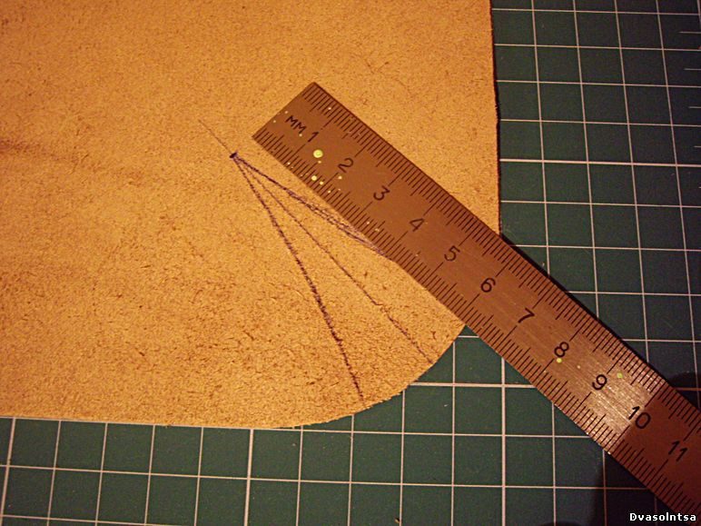 В закругленных углах нам нужно еще нарисовать и вырезать вытачки, чтобы сумка не была совсем уж плоской (хотя можно и без них, но когда сумка будет слишком наполнена содержимым, она будет некрасиво деформироваться). Мне очень легко было нарисовать вытачку, так как на моем коврике есть разметка, с помощью которой я запросто рисую диагональ в 45 град.