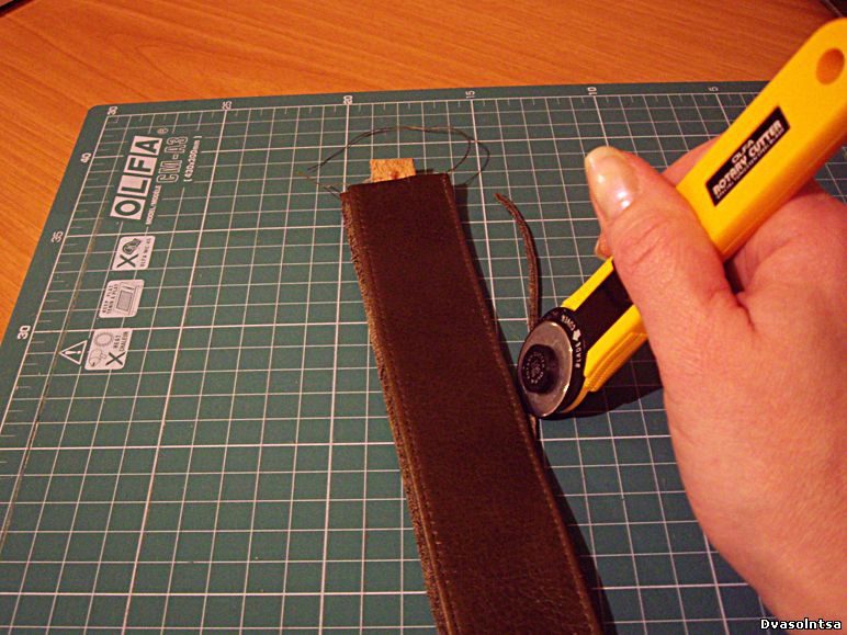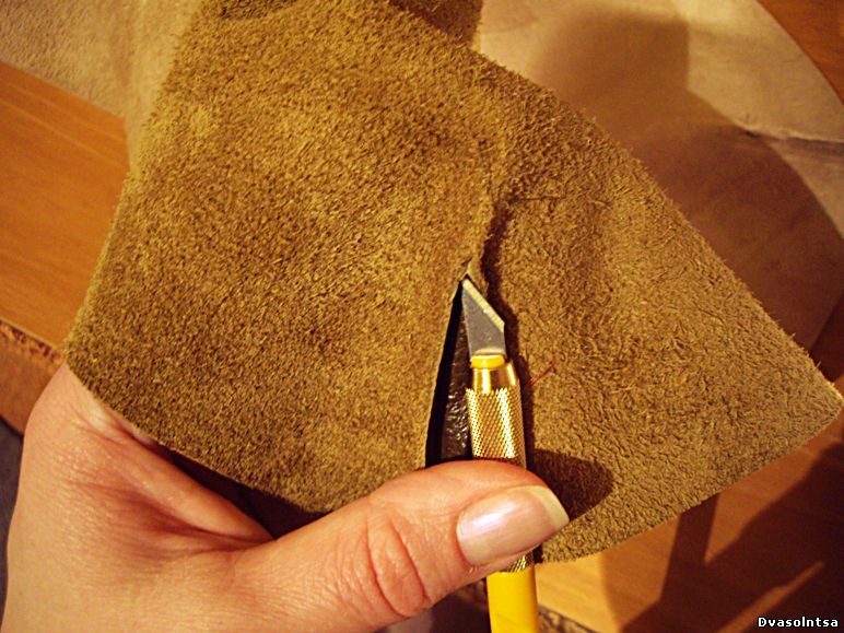 Очень надеюсь, что у Вас имелись длинные полосы кожи, из которых Вы вырезали 4 целиковые детали длиной примерно 60 см — две из них шириной 3-4 см, и две в два раза шире, то есть 6-8 см. Мне так сильно не повезло и потому пришлось делать ручки сшивные. Если Вам не повезло так же, как и мне, то пригодится один секретик. На ручках лишняя толщина швов нам ни к чему — это и некрасиво и будет довольно трудно прошить эти места на машине. Поэтому лучше будет край кожи «спустить», то есть сделать его тоньше. Разумеется, специального ножа для кожи у Вас нет? У меня тоже. Но есть обычные лезвия. Только новые, острые! Старыми сделать ничего не получится. Положите полоску кожи на ровную поверхность (дощечка, картон). Лезвием аккуратно и осторожно срежьте мездру (мохнатую изнанку кожи), сводя толщину к самому краю на ноль. Срезайте маленькими кусочками движениями к краю. Потренируйтесь сначала на ненужном кусочке, так как довольно легко прорезать кожу насквозь, а это было бы крайне нежелательно)