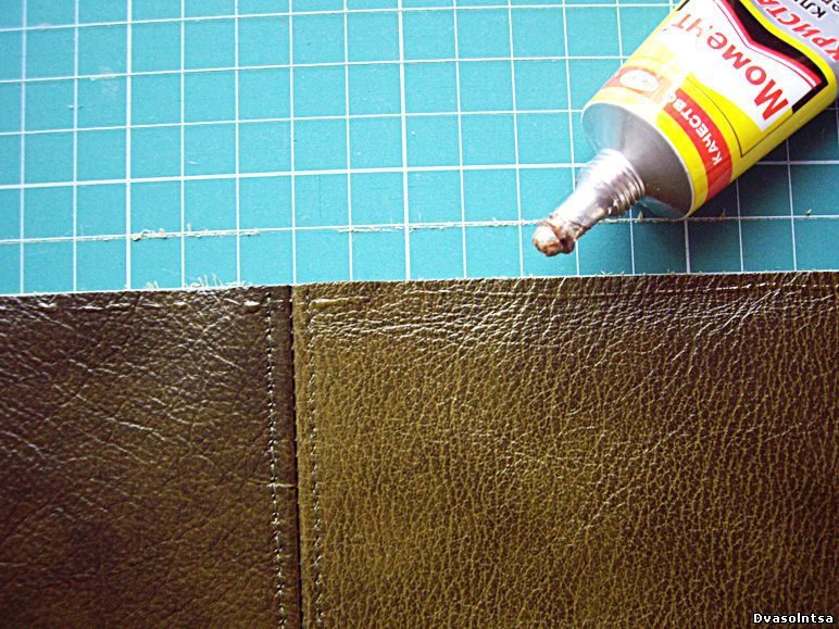 Первое — ни шагу без клея! Кожа — замечательный материал, но скользит, убегает, вытягивается… Сметать мы ее не можем, естесственно. Остается что? Правильно! Склеить! Клей должен быть эластичным, не особенно разъедать краску и при необходимости легко расклеиваться. В домашних условиях очень хорошим вариантом является клей «Момент Марафон». Он хорош еще и тем, что если немного клея попало случайно на лицевую сторону изделия, то его легко удалить обычным ластиком.