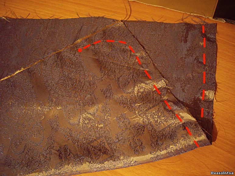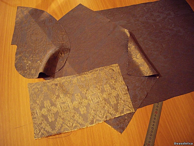 Пока мы еще не начали всячески измываться над этими деталями, нужно кое-что сделать. Выкроить подкладку. Укладываем одну деталь на два слоя подкладочной ткани и вырезаем по контуру. Сверху и снизу припуски не делаем, а по бокам прибавляем по сантиметру: