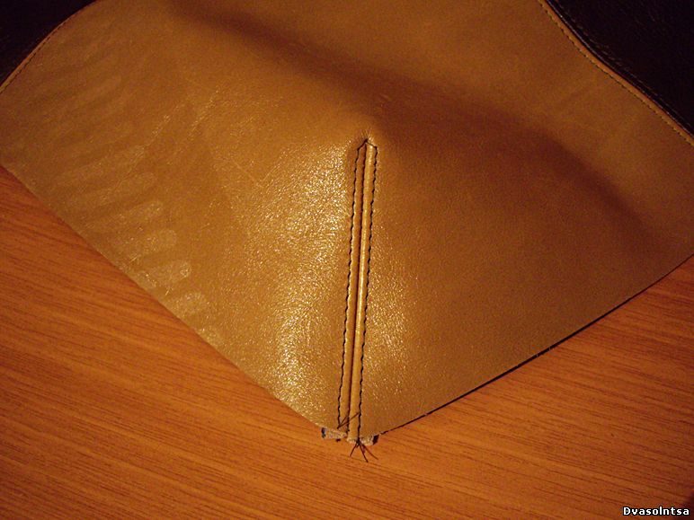 У меня каждая деталь мешковины состоит из четырех прямоугольников. Возможно, Вы — счастливая обладательница огромных кусков кожи и детали будут выкроены целиковые. А возможно, что они будут сшиты из бОльшего количества кусочков. Возможно, Вы сошьете их так же, как я — швы «вразутюжку» и отстрочены. Можно сшить натуральную кожу швами наружу. Можно встык зигзагом. Не важно. Некоторые приемы работы с кожей будут Вам полезны в любом случае.