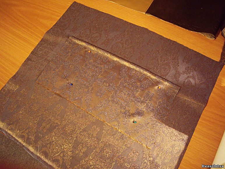 Берем самый маленький из них, два раза подгибаем длинную его сторону и прострачиваем. Прикалываем булавками к одной из больших мешковин на расстоянии примерно 7-8 см от верхнего края и пришиваем, подгибая припуски на швы: