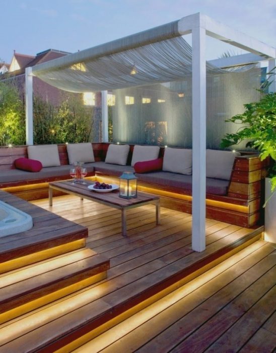 Необычная веранда на даче без навеса и со ступеньками с еще более необычным освещением.