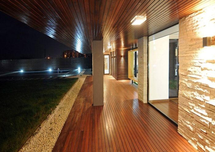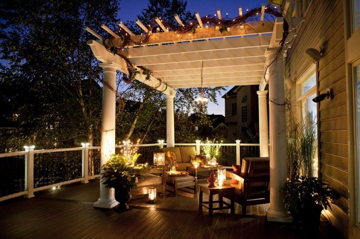 Нетривиальный дизайн веранды с хорошо подобранным освещением на территории загородного участка.