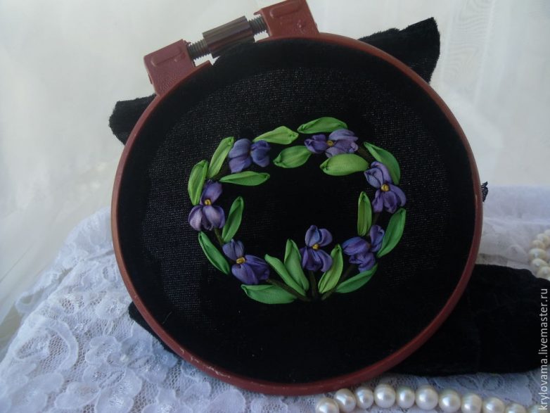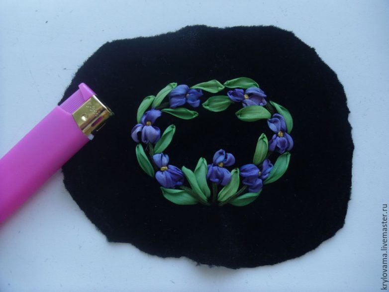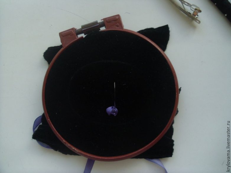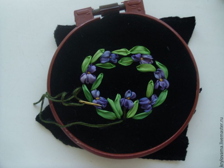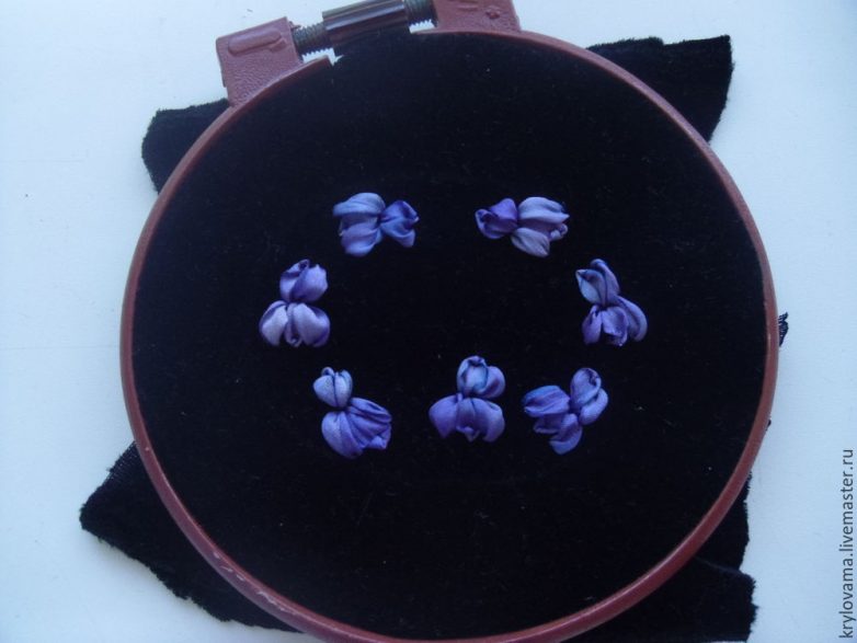 Рисунок у меня выбран — это будут 7 ирисов, вышитых по овалу, лучше их тоже прорисовать, я обойдусь без этого. Начинаем с нижнего среднего лепестка, протыкая его, протаскиваем ленту.