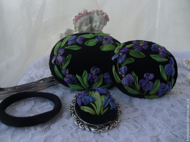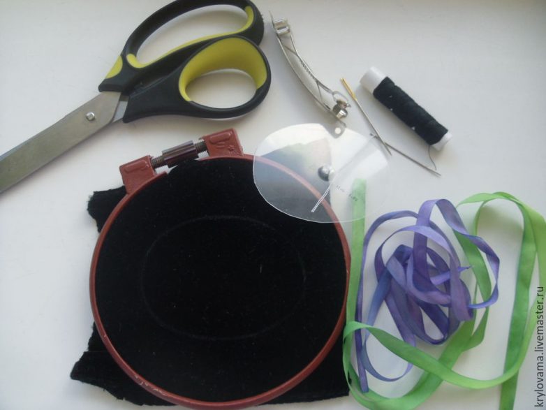 Для этого мне потребуется бархат, х/б ткань, ленты 0.6 мм, нитки ножницы, игла, пластиковая основа и ватные диски. Сразу хочу сказать, что этот мастер-класс для тех, кто немного умеет вышивать. Кто не вышивал, советую начать с более крупной вышивки, так как заколка будет размером 6-7см.