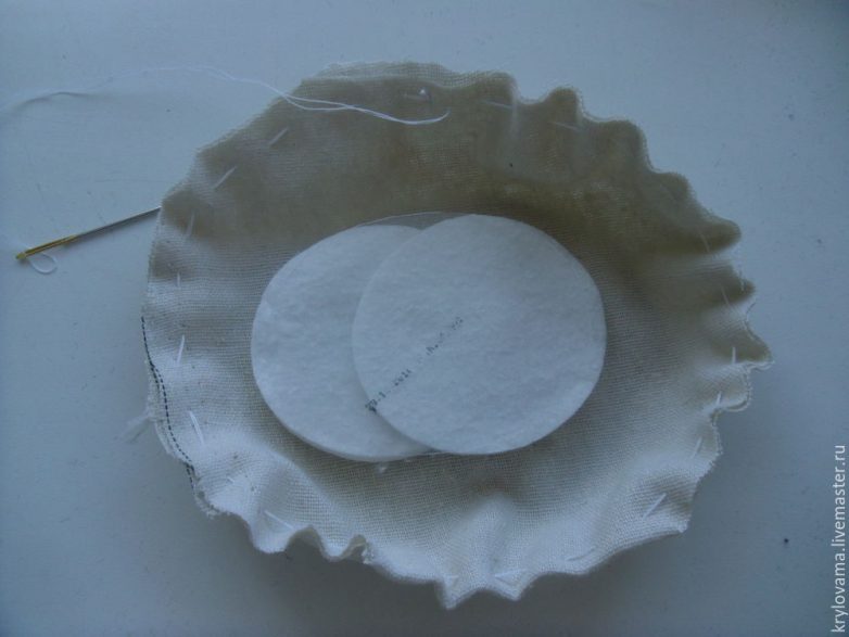 Собрали х/б ткань, положив внутрь ватные диски и основу. Стянули, прошили.