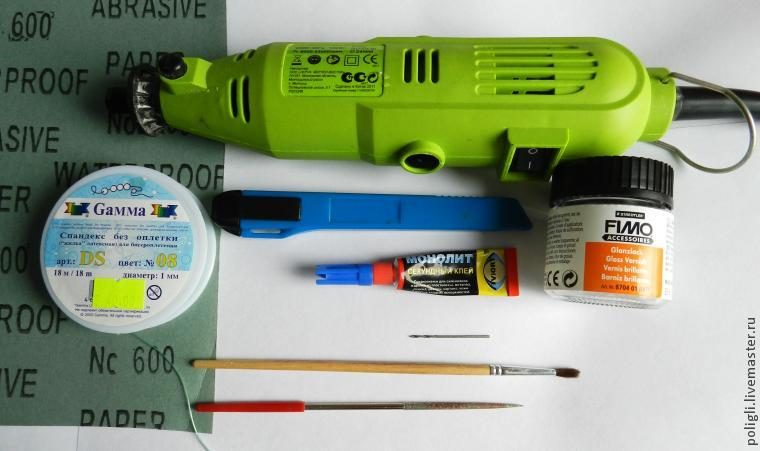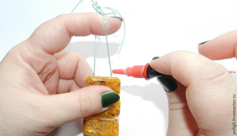 Сквозь просверленные отверстия продеваем резинку, завязываем в узелки. Узелки фиксируем клеем. Обрезаем излишки резинки.