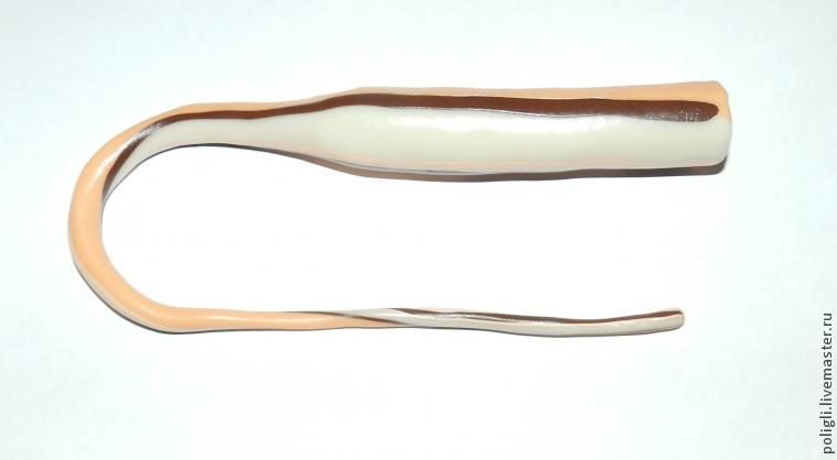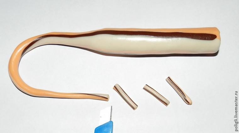 Делаем заготовку колбаски, внимание обратите как расположены отрезки разноцветной пластики.