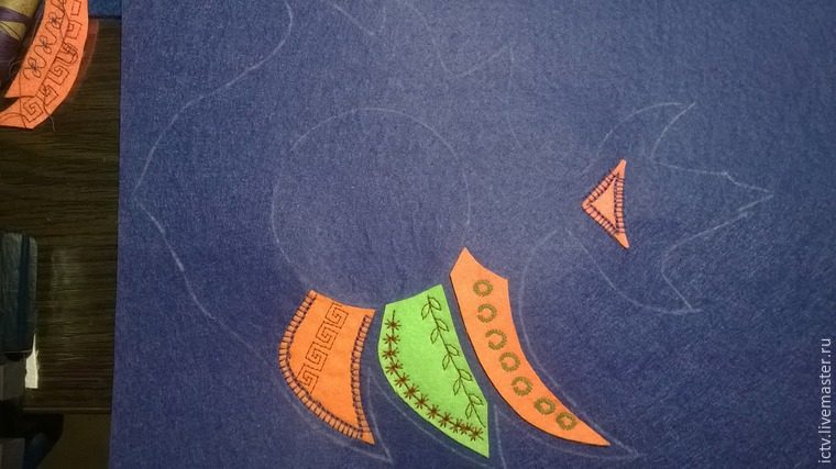 Совет: тяжелее работать со сложными формами, как у меня, легче с обтекаемыми. Можно эскиз разрисовать маркерами и прикладывать кусочки фетра, чтобы понять, что вы хотите сделать. Все в ваших руках. Я не выкладываю все фото, чтобы не утомить и не запутать, но много прикладывала и меняла местами, в общем искала.