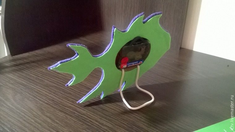 Клеим глазик клеевым пистолетом на рыбку (ножку глазика предварительно отрезаем, можно раскаленным на огне ножом, можно инструментом, если есть), прикручиваем часовой механизм и просто вставляем подставку в заднюю стенку часов. Подставку даже не нужно ни чем крепить, все держится достаточно крепко, так как проволока достаточно толстая и жесткая.