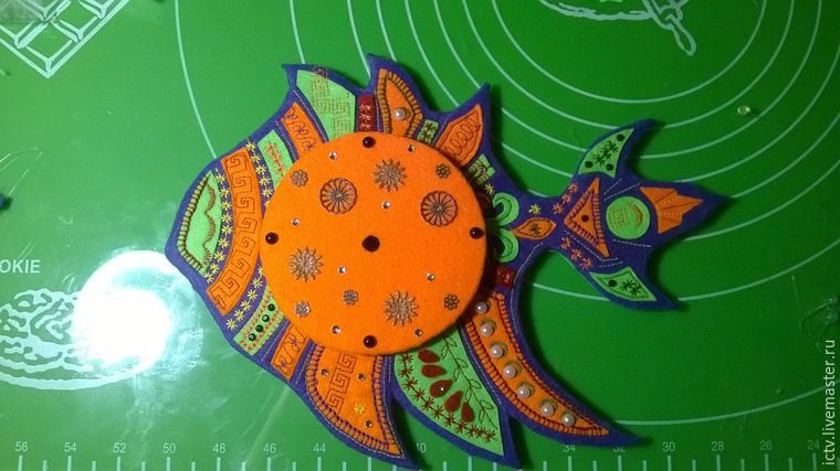 Когда закончили пришивать орнамент, приклеим стразы и пайетки или можно пришить бусины и т.п. После этого вырежем «с припуском» рыбку из фиолетового фетра и приклеим ее клеевым пистолетом на платформу.