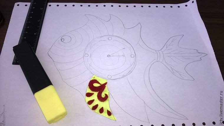 Рисуем эскиз рыбки. Вдохновение и рисунки можно найти в интернете. Рисунков рыбок огромное множество. Я нарисовала эскиз от руки, подсмотрев в интернете. Но очень просто «погуглить», выбрать любой рисунок в интернете, приложить кальку на экран монитора и фломастером обвести, затем вырезать кальку и сделать выкройку.