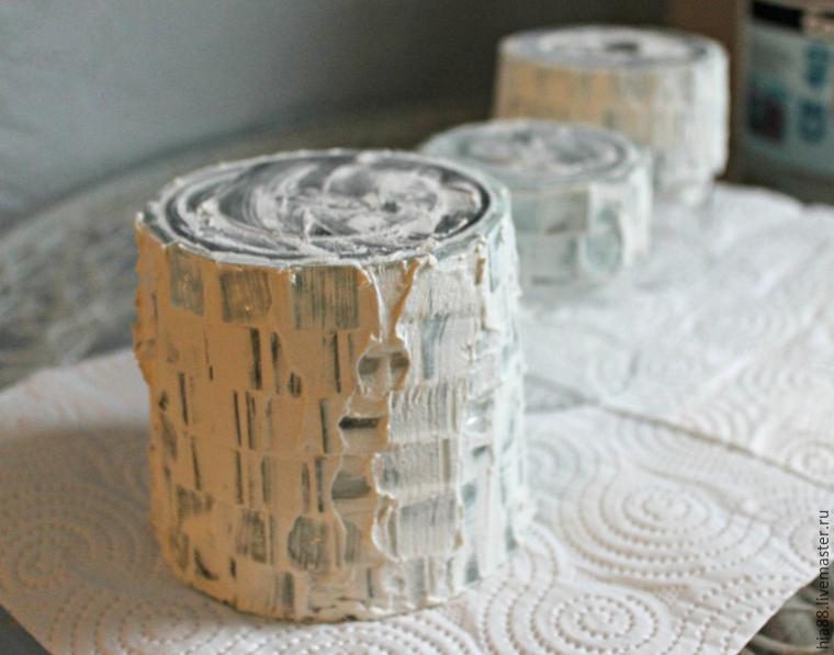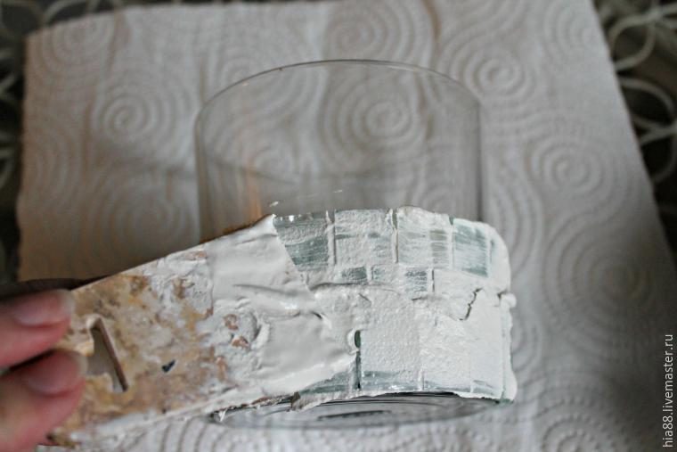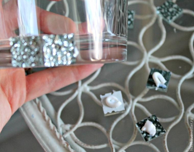По такой же технологии выкладываем мозаикой и другие стаканы. Мне показалось, что интереснее будет, если я выложу на стакане мозаику из нескольких рядов, а не целиком.