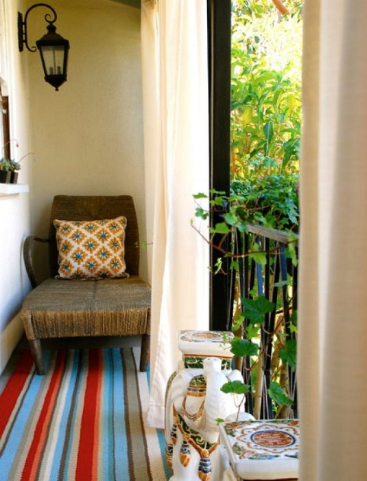 Открытый уютный балкончик с одним единственным креслом, плотной занавеской, яркой ковровой дорожкой и несколькими декоративными вазами может стать любимым местом для уединения и отдыха в теплое время года.