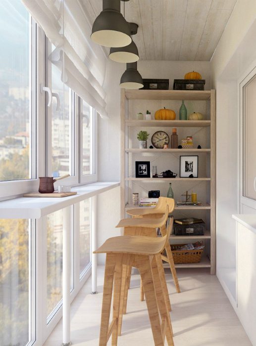 Чудесная лоджия, оформленная в ультрамодном скандинавском стиле с узкой барной стойкой-подоконником, деревянными стульями и стеллажом для хранения всякой всячины.