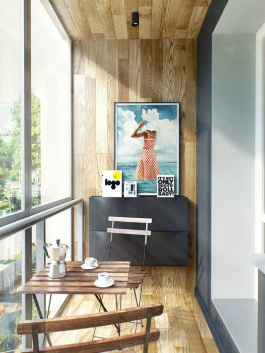 Узкая лоджия в стиле лофт с деревянной отделкой, панорамными окнами, элегантным черным комодом и небольшой обеденной зоной со столиком и стульчиками — оптимальный вариант оформления уютного пространства с минимальными затратами.