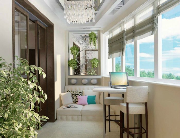 Роскошная светлая лоджия, отделенная от комнаты стильными раздвижными дверями, с очаровательным низким диванчиком и компактным высоким столиком, который прекрасно подойдет для чаепитий или для работы за компьютером.
