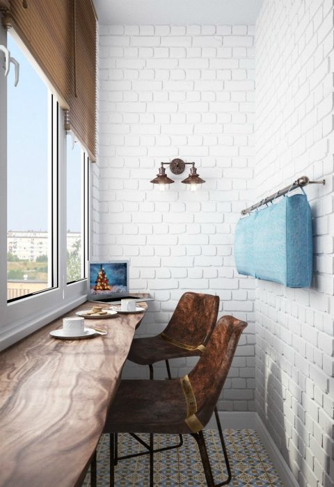 Стильная лоджия с белыми кирпичными стенами, подоконником-барной стойкой, выполненным из массива дерева и парой высоких стульев, станет прекрасным местом для вечерних посиделок с друзьями.