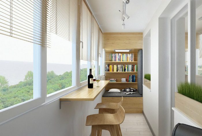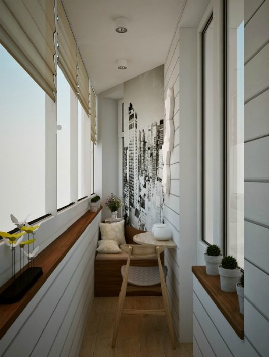 Узкая лоджия со светлыми стенами, встроенным деревянным диванчиком, откидным столиком и акцентной стеной, украшенной фотообоями с перспективой, визуально увеличивающими объемы пространства.