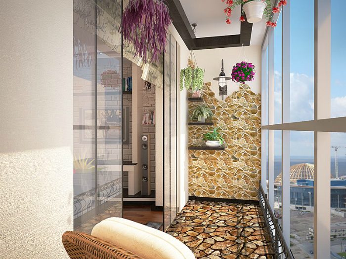 Чудесная лоджия в стиле прованс с оригинальной отделкой из искусственного камня и штукатурки, огромными панорамными окнами, плетеным креслом и обилием цветов.