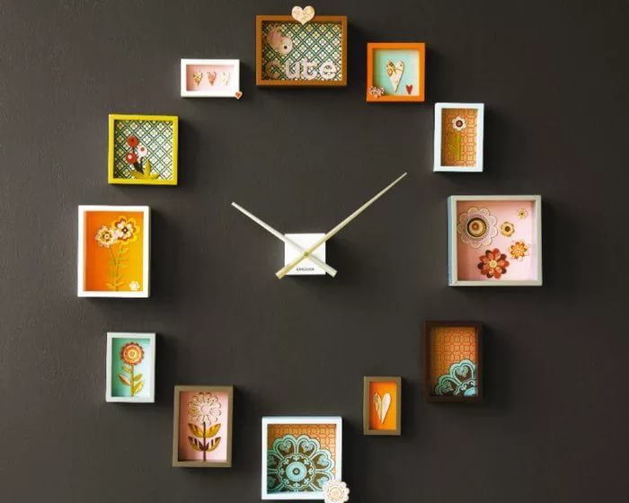 Двенадцать маленьких коробочек, которые можно сделать самостоятельно, используются вместо указателей на циферблате. На дно коробок приклеиваются обрезки обоев. Часовой механизм возьмите из старых часов или купите в магазине товаров для рукоделия.