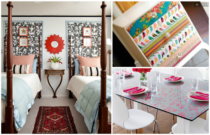 Преображение мебели.Просто окрасить старую мебель в один цвет — самое очевидное решение, если хочется дать новую жизнь надоевшим предметам интерьера. Но результат вряд ли будет впечатляющим. Стоит использовать для декора мебели остатки обоев — и внешний вид ее станет действительно оригинальным.