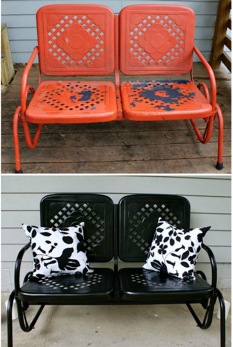 Самый простой способ облагородить уличную металлическую скамью — покрасить ее в новый цвет. Лучше всего для этого использовать цвета темного спектра, а чтобы краска легла максимально ровно, скамью нужно предварительно очистить от старой краски.