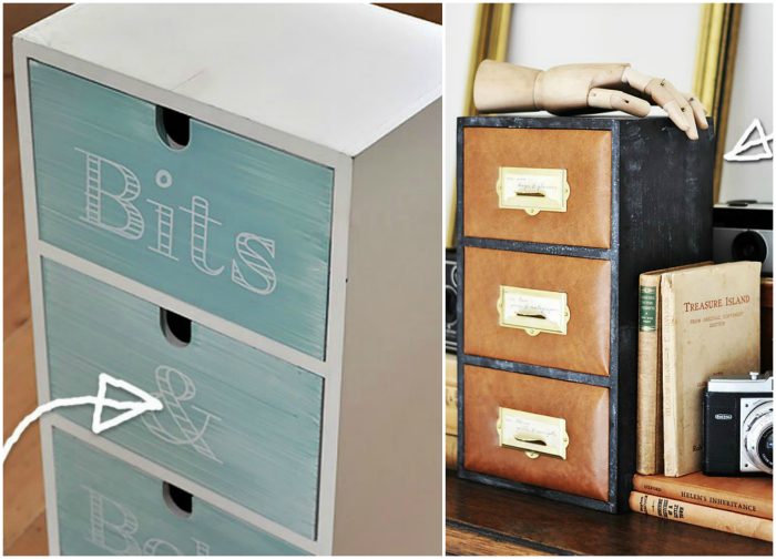 Аккуратная кожаная обивка позволила превратить обычный шкафчик для канцелярии в элегантное и стильное бюро, которое станет достойным украшением любого рабочего стола.