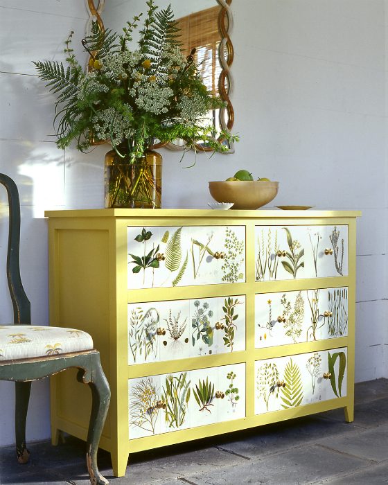 Классический комод обрел новую жизнь благодаря новому цвету и картинкам в ботаническом стиле, выполненных в технике декупаж.