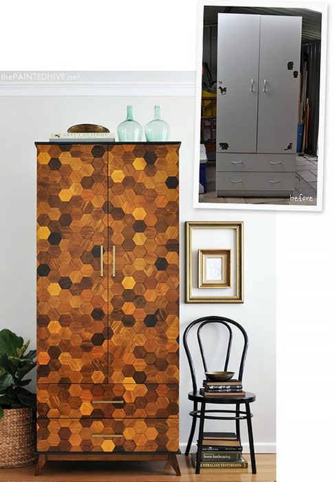 Множество маленьких шестиугольников разных оттенков, наклеенных на фасад невзрачного шкафа, позволят превратить его в изысканный и уникальный предмет мебели, который, без преувеличения, станет заметной деталью любого пространства.