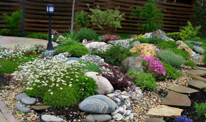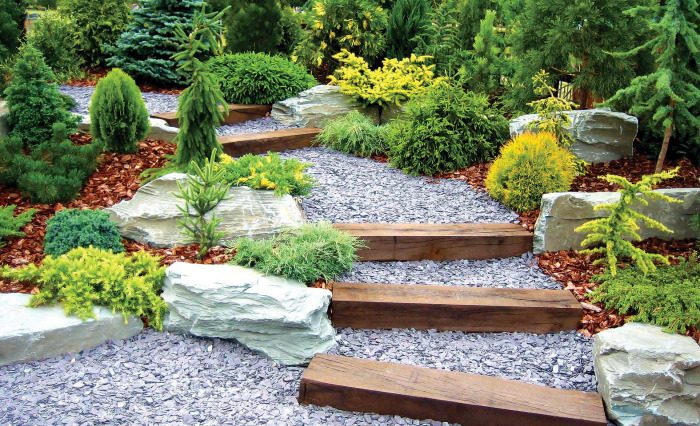 Альпийские растения хорошо сочетаются с разными видами камней, декоративным гравием или галькой.