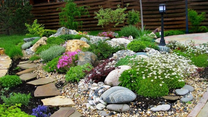 Живописный ландшафтный дизайн, созданный благодаря правильно обустроенному рокарию.