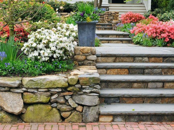 Лестница, украшенная камнями.На первый взгляд кажется, что лестница на улице — чисто утилитарная конструкция. Но, украшенная камнями, она становится еще и эффектным садовым декором.