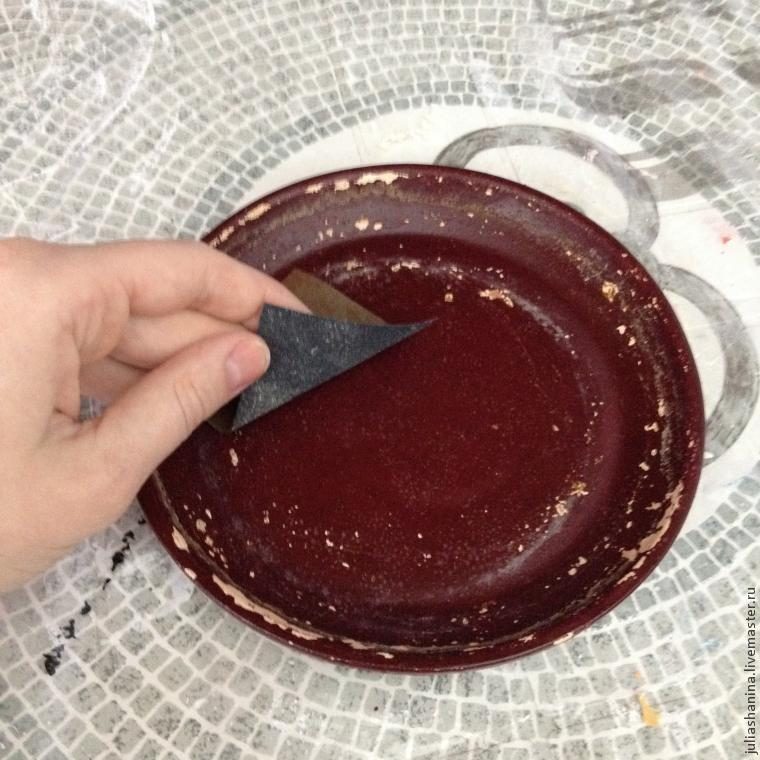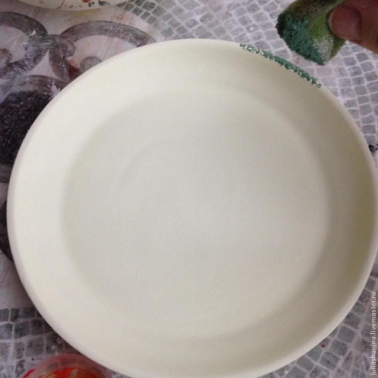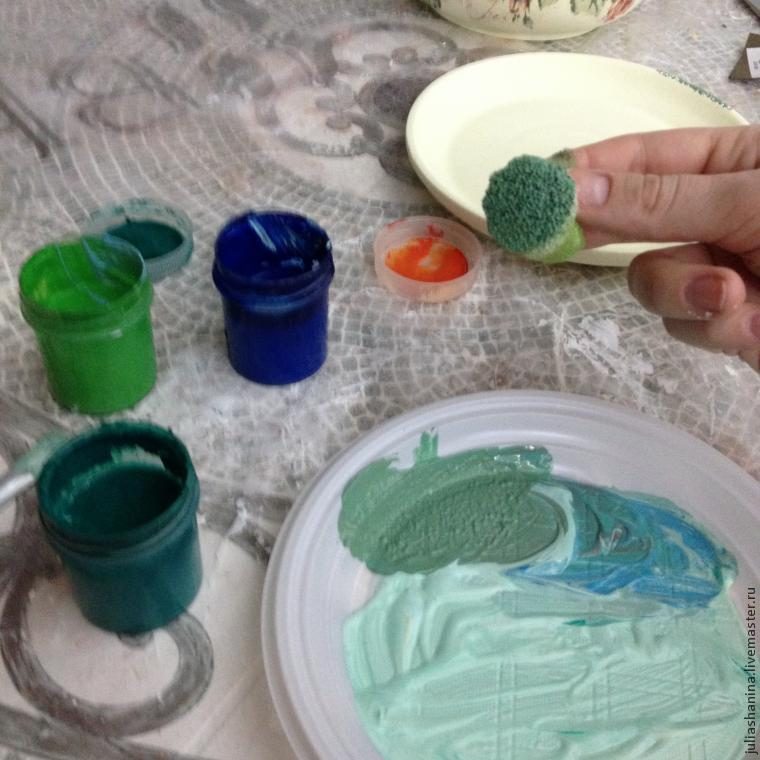 Смешиваем цвета для каймы. «Причпокиваем» губкой по краю блюдца и горшка.