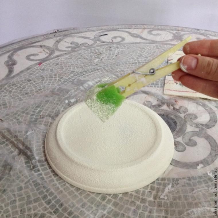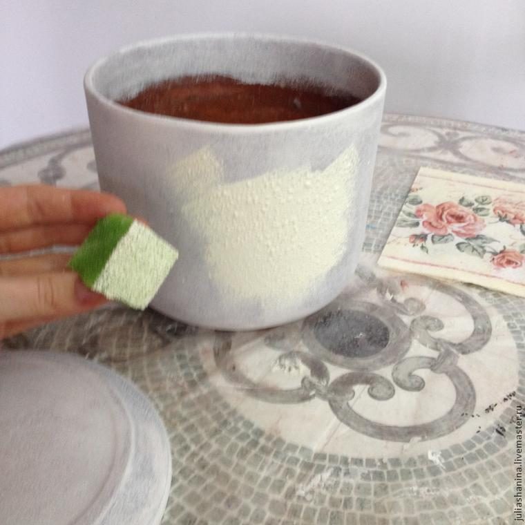 Берем ариловый грунт и кусочками губки, «причпокивая», наносим его на горшок. Вместо грунта вполне можно использовать и простую белую краску. Наносите грунт тонким слоем, иначе избыток краски будет давать трещины и долго сохнуть.