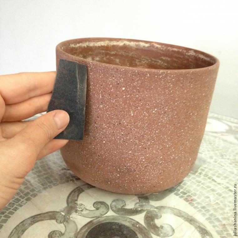 Когда на файле останется одна салфетка, прикладываем его к горшку и разглаживаем.