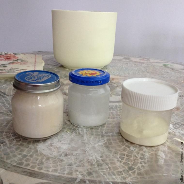 Затем наносим фоновый цвет. Для моего горшка потребовалось 3 столовых ложки белой краски и пару капель желтой, так как фон я подбирала под фон салфетки.