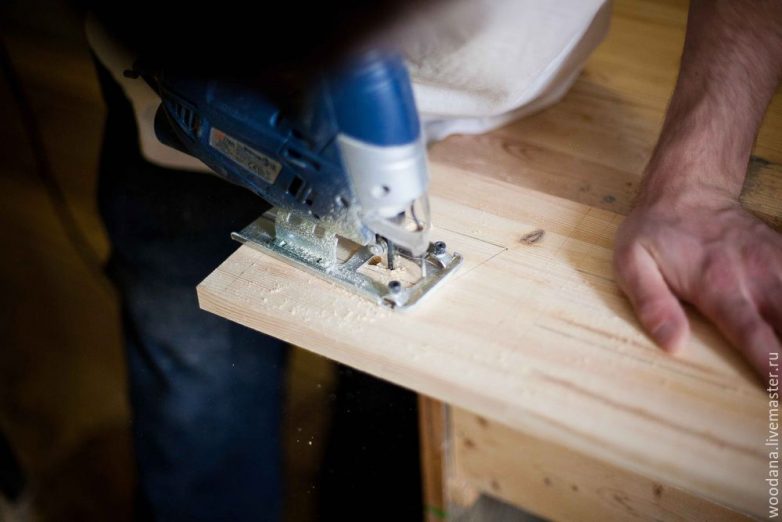 6. По нарисованному контуру, вырезаем электролобзиком дверки и окошки. Для лучшего качества обработки оставляем запас 3-5 мм под обработку фрезером.