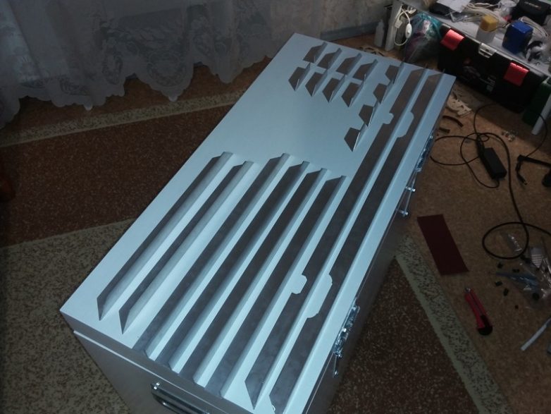 Для покраски все металлические элементы кроме навесов снимал. Красил акриловой краской. Не пахнет. Красил прямо в комнате. Кажется, было 3 или 4 слоя. Кстати, перед покраской покрыл акриловым грунтом (белая бутылка за чемоданом).Установил газлифты