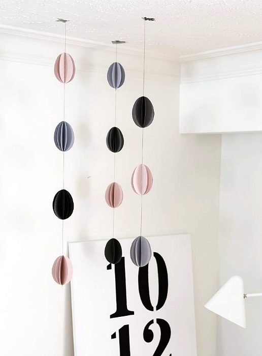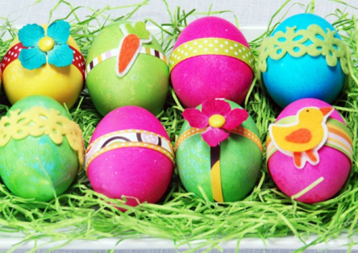 Украсить интерьер к празднику поможет лоточек яиц, покрашенных в яркие цвета и декорированные лентами, кружевом и бумажными фигурками.