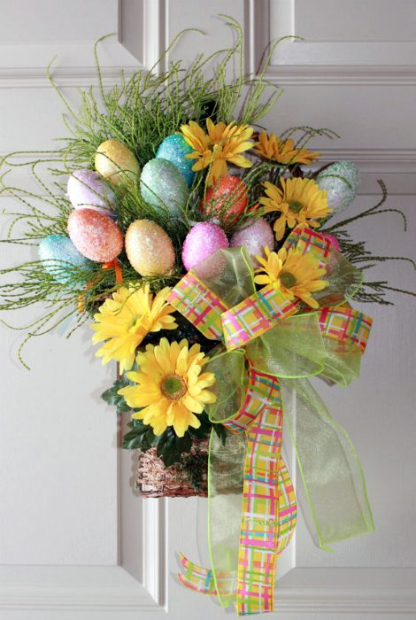 Оригинальное настенное украшение, которое можно сделать из небольшой корзинки, живых или искусственных веточек и ярких пенопластовых яиц.
