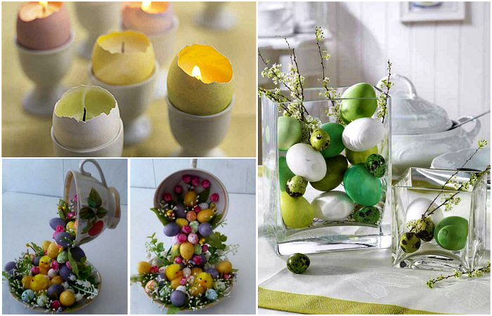 Прозрачные вазы, наполненные перепелиными или покрашенными куриными яйцами, станут оригинальным элементом домашней обстановки и прекрасным пасхальным украшением.